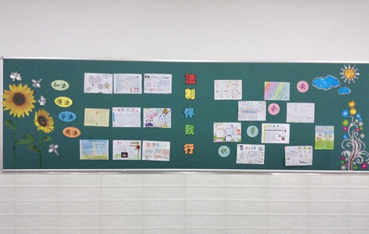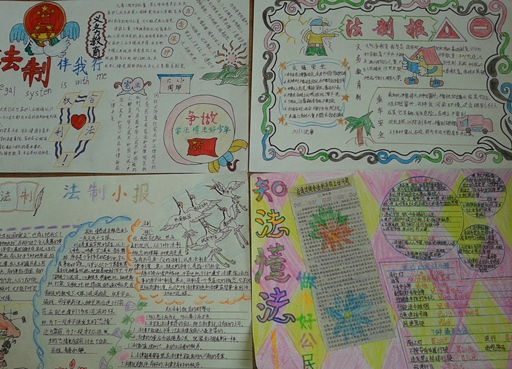 在我校,手抄报是第二课堂的一种很好的活动形式, 法制手抄报更是一种很好的宣传工具,可以用来布置黑板报,丰富同学们的法制知识。 在法制宣传月活动中,我校从学校实际出发,于11月底就开展了以“法制安全在心中”为主题的法制教育手抄报为主要设计模式的黑板报评比活动。各班级在班主任老师的积极组织下,同学们踊跃参与,集思广益,设计的手抄报板报版面精美、内容丰富有趣,所列举事例易懂、易记、易普及。同学们在课间兴趣盎然的观赏和阅读,既直观的了解了法制方面的知识,又相互学习了板报设计技巧,丰富了同学们的课间文化生活。此次评比展出活动的开展,调动了学生参与活动的积极性主动性,充分发挥了他们的想象力、创作力及动手能力,寓教育于活动之中,把法制宣传普及与校园文化活动紧密结合了起来,为深入推进平安、和谐校园建设奠定基础。
